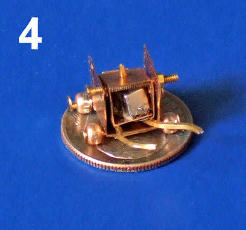 Foto 4 - que se trasladó a los cuatro a bordo motores que normalmente tomaría hacerlo suspendiendo simplemente un imán horizontalmente sobre un cardán de dos ejes. Dos imanes de 1/8 "x 1/8" x 1/16" se ajustaron a un eje vertical del alambre que se dobla para formar un dedo de la pinza. Los dos imanes se alinean actúan como un imán y crear un motor solo imán. Esto está montado en la caja más pequeña que tiene el otro dedo de sujeción soldado a él.