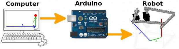 Utilizaremos dos servomotores, cada uno conectado a un brazo articulado. Cada brazo se hace de dos segmentos articulados, conectados a un servomotor en un extremo y a la herramienta de escritura en el otro extremo. La posición de la escritura final de los brazos del robot está totalmente determinada por dos ángulos controlados por los servomotores.