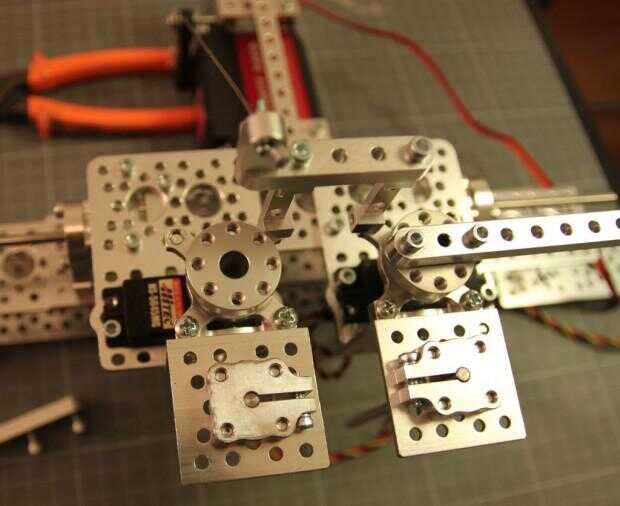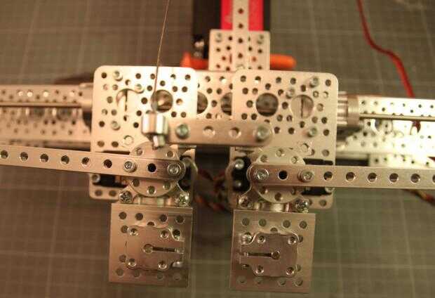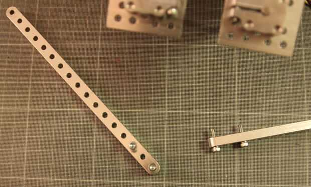 Fije las vigas en las conexiones de servo. Tenga en cuenta que el 2 º agujero de la viga está en línea con el eje de rotación del servo. La longitud eficaz del segmento brazo es por lo tanto 16 agujeros (5.6").