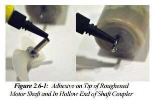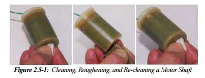 1. Limpie el eje de cada motor con un paño esterilizado (o una toalla de papel humedecido con alcohol isopropílico) para quitar cera sobrante que quede después del proceso de encapsulamiento, como se muestra en la figura 2.5‐1. Luego use un pequeño trozo de papel de lija para desbastar la superficie de cada uno de los ejes de motor (esto puede hacerse haciendo girar el eje contra el papel de lija mientras enciende la hélice mediante un cuadro de control pre‐made). Luego limpie cada eje propulsor nuevo con otro cojín del alcohol (no uno usado para quitar la cera de arriba). Limpieza del eje es muy importante en orden para que el adhesivo se adhiera a él!
