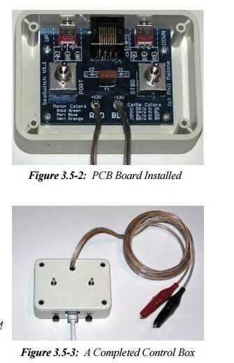 7) una vez que estés seguro de que hay no hay cortos circuitos y que los motores de hélice lecturas adecuadas, puede terminar de armar la caja de control. Coloque la placa en la caja de control, pasando los botones de actuador de interruptor de botón con cuidado por los dos agujeros en el frente de la caja y asegure el PCB en la caja usando los cuatro tornillos pequeños de plata, como se muestra en la figura 3.5‐2.