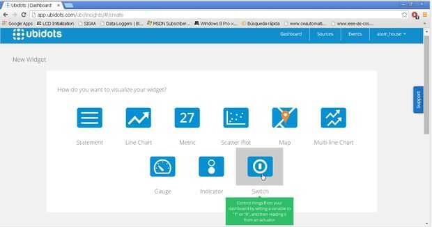 Seleccione un Widget de interruptor y vincularla a la variable "válvula". Este widget escriba "1" ó "0" a la variable de "válvula", que te encuesta después de la Raspberry Pi.