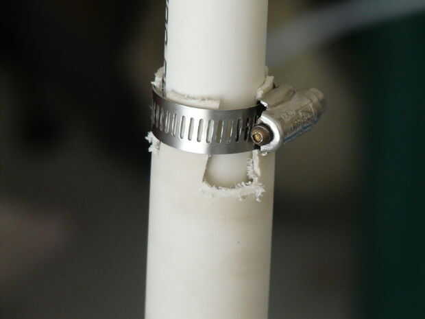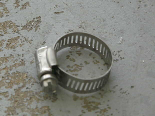A continuación, afloje la abrazadera de la manguera y colóquela en la parte superior de la tubería como se muestra. Apretando esta pinza, tiene un soporte ajustable.