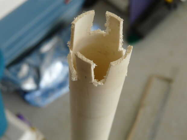 La mejor manera de hacerlo es hacer lento hacia arriba cortes solamente, haciendo un paso, luego volverlo a conectar y hacer otro paso hacia arriba hasta la profundidad deseada se logra. Sesión de aproximadamente 1" abajo de la tubería. Usted necesita cortar 4 segmentos para hacer que el tubo tiene 4 secciones intactas más o menos equidistantes. Esto nos permitirá exprimir el tubo de 3/4".