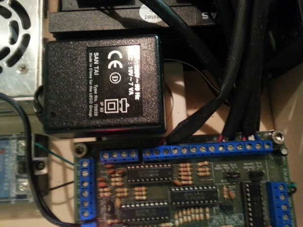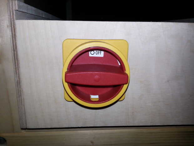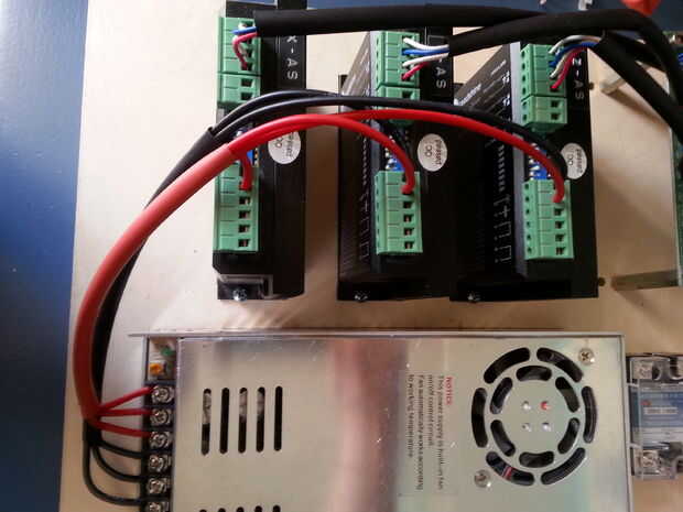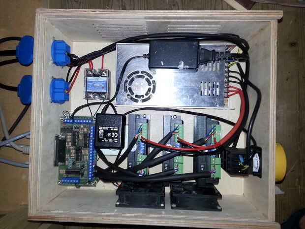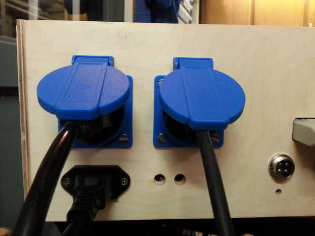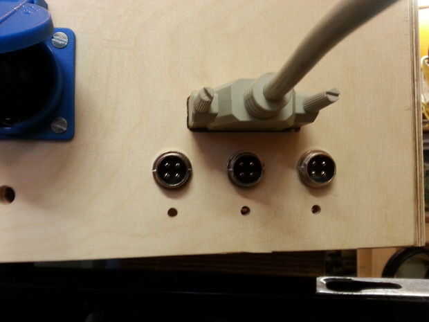 Todos los cables se pueden conectar en la parte posterior del recinto. Usé hilo especial de 4 enchufes, porque quería ser capaz de desconectar la electrónica de la máquina, sin tener que desenroscar a cualquiera de los terminales del cable. También instalé dos tomas de corriente para proporcionar energía en el eje y un shopvac. Las tomas de corriente están conectados al relé para encender el router y desactivar automáticamente en Mach3. Montara una PowerSwitch para grandes en la parte frontal del recinto.