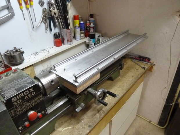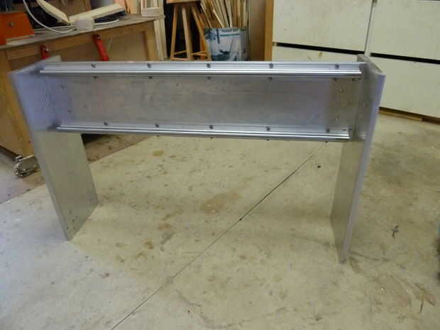 La placa en la parte inferior del pórtico es muy simple. Perforé 6 orificios para fijar a las placas laterales. En el medio tuve que taladrar dos orificios para el soporte de la tuerca de montaje.