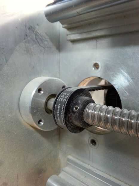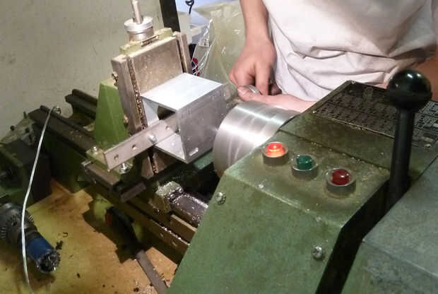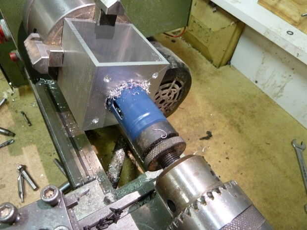 Empecé haciendo un gran agujero en un lado de la montura con una sierra. Esto permite que el motor para sentarse a ras con la superficie y también hace que el eje esté centrado. El motor se fija al montaje con cuatro tornillos de M5. He hecho cuatro ranuras, en el otro lado del Monte, para permitir que se deslice hacia adentro y hacia afuera. Sujeta la pieza un accesorio especial torno fresar las ranuras.