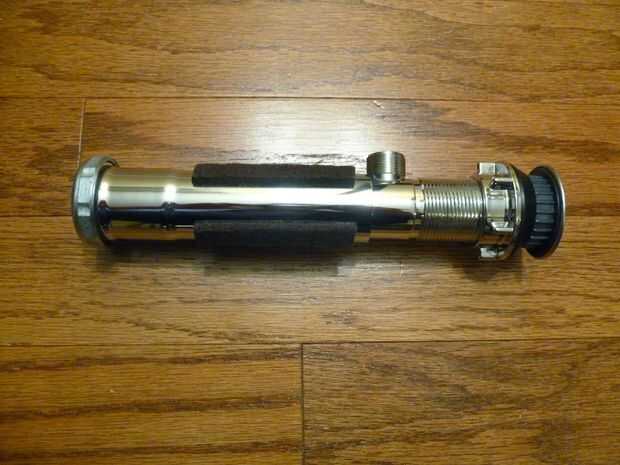 Deslice el extremo no roscado del tubo de extensión sobre el extremo no roscado de la pop-up arandela. Esto debe ser un ajuste apretado, si no, utilice cinta para aumentar la tensión de ajuste. Con dos de mis espadas el ajuste era perfecto, con la otra que usé cinta adhesiva envolviendo la polywasher para un ajuste apretado.