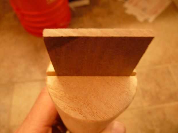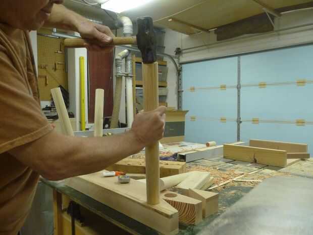 Cada espiga tendrá una cuña. Son 2" largo, un poco menos ancho que el diámetro de la espiga y, en la parte superior, son aproximadamente 1/16 de pulgada de más grueso que la ranura corta con un grado 2 o 3 forma cónica. La idea es que cuando es golpeado el pasador en el orificio de la cuña golpea la parte inferior, es conducido en la muesca y causa la espiga a separarse y se sujete en su lugar. Nunca saldrá. Aplique pegamento a la pierna, el agujero y cuña e instale. Tenga en cuenta que estoy utilizando un martillo muy grande para instalar el pasador y colocar la cuña. Instale el pasador para que la cuña funciona perpendicular a la veta de la mesa. Esto mantendrá la mesa de la división.