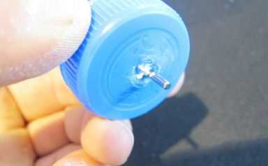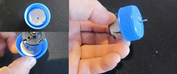 3. Aplique pegamento caliente en el interior de la tapa, pero no en el agujero. Deslice el eje del motor a través del orificio. Cuando se seca, el eje debe giren libremente.