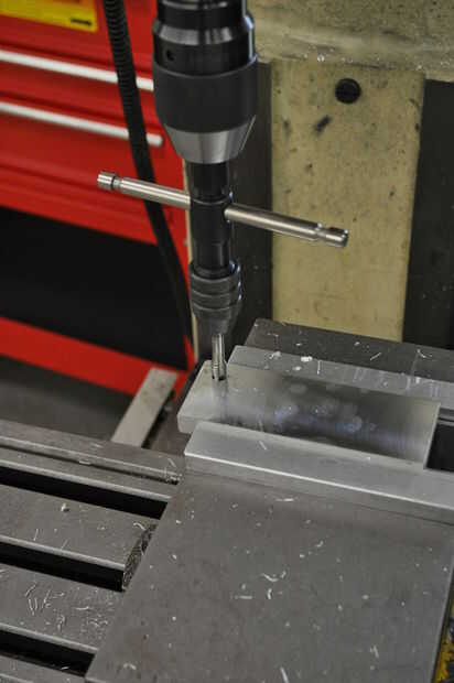 Para la rosca, usé una llave de grifo con un guía. La guía va en el portabrocas y tiene el extremo posterior de la llave del grifo. Esto asegura que el grifo va en el material directamente en vez de en un ángulo. Teniendo la llave entrar en ángulo puede producir roscas angulares (que no funcionan bien con el perno de hombro) o incluso rotura de grifos. Esto es especialmente un riesgo en materiales blandos como el aluminio. Si no tienes una llave de grifo como este, recomiendo conseguir uno. Su defecto, tenga cuidado de que la llave va en recta! (Tenga en cuenta que el molino es utilizado para sujetar a la guía de llave de grifo; girar la llave a mano, y el eje del molino es, para este proceso).