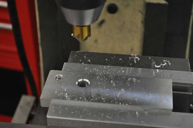 Acabado el bloque de base con un modesto avellanado en la parte posterior del bloque; Esto ayudará a que sea más fácil introducir una pila de imanes. También puede avellanar la rosca un poco; se trata de una manera fácil de quitar las rebabas después de golpear ligeramente. No hacer demasiado o perderás la superficie plana para el perno de hombro descansar contra.