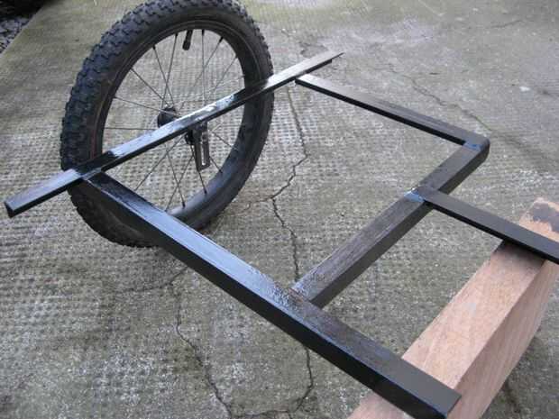 El montaje de la rueda se coloca a medio camino a lo largo del borde del marco y soldadas con autógena en lugar.