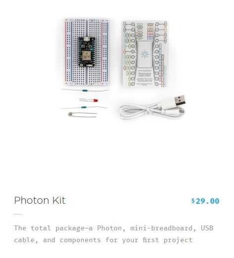 Para comenzar con, nos vamos a basar nuestro dispositivo por el tablero del fotón, de partículas. Vas a querer recoger el paquete "Kit de fotones", actualmente disponible para $29.00*. Estas placas son grandes, porque una vez que les creó, se puede programar en la web mediante un navegador web. Es muy limpio para ver como se actualiza el código en el dispositivo del parpadeo!