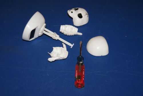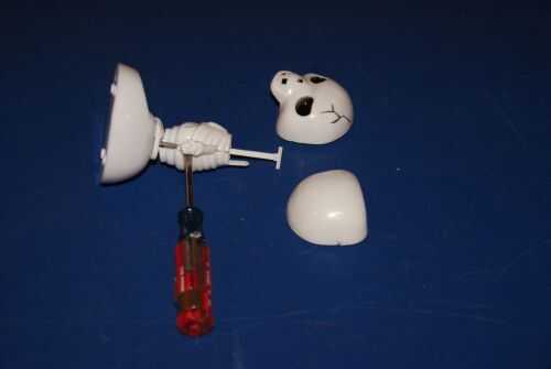 La cabeza y el cuerpo están moldeado plástico partes delantera y traseras que aparte con un poco presión de la atornilladora. Con cuidado, inserte el destornillador a lo largo de las costuras y husmearlos apart. No se pegan juntos por lo que son muy fáciles de abrir.