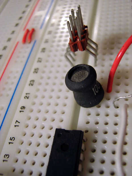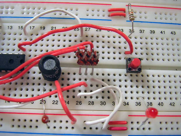 Una vez que hayas colocado el interruptor, ejecute una línea desde la parte superior izquierda pin a pin 1 RESET en el AVR. Luego coloque un lado de una resistencia de Ohm k 10 de ese mismo pin del interruptor y coloque al otro lado de la resistencia en un + 5V tren. Esto actúa como un pull-up. En el otro lado de la brecha y en el otro lado del interruptor, coloque el extremo positivo (el pin más largo) de un LED de 3mm de color rojo y correr al otro lado a la tierra. Normalmente colocarías una resistencia en el medio pero con una corta ráfaga nunca he tenido que. La siguiente imagen muestra lo que debería ser el circuito de reset.