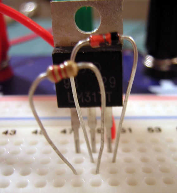 Ejecute su línea positiva detrás el LM317 para el perno en (derecha). Frente a la LM17 Conecte el diodo de salida (pin central) a en (extrema derecha). A continuación, conecte el resistor de 220 ohmios de hacia fuera para ajustar (izquierda). Revisa las imágenes.