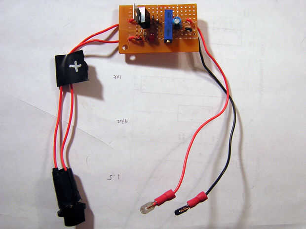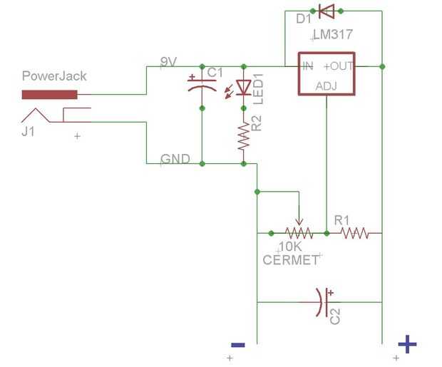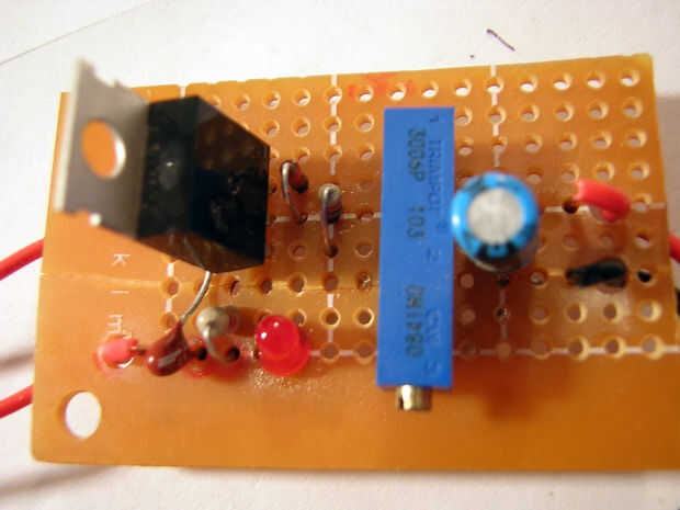 Haz un tablero pequeño proto o cortar un cuadrado de un tablero de gran rendimiento como yo lo hice. Coloque los componentes en el tablero en el mismo orden que te los pones tu protoboard: 0.1uF, led -> resistencia de detrás el LM317. Diodo y resistor en frente del LM317, el trimmer cermet, luego el condensador de 1uF. Perfore agujeros en ambos lados para conexiones de alambres para aliviar el estrés. Usted puede lanzar en un gran escudo de calor honkin'en el LM317 pero no lo necesita. He corrí mi regulador durante días y aun no se caliente.