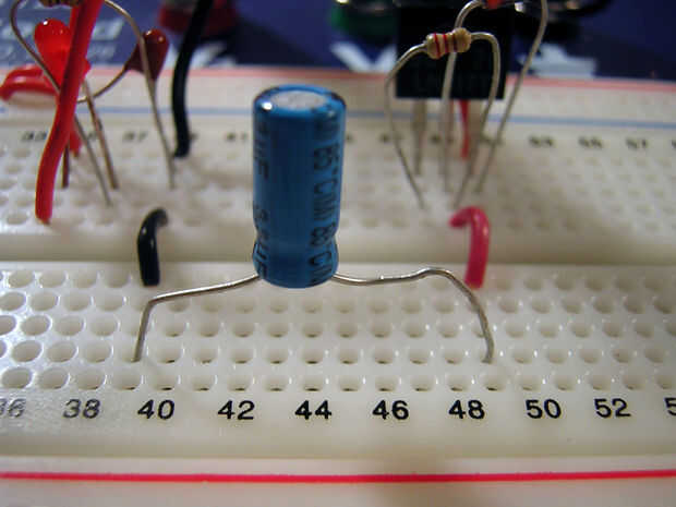 El trimmer cermet viene después, pero hay no hay fotos de ella en el protoboard. El cuadro con el condensador es la pieza final y el cermet sería estar entre los cables rojo y negro y el condensador. Traste no, la próxima exhibición de pasos cómo mover su tablero y en una tarjeta permanente por lo que se puede utilizar con todos los proyectos que necesitan una fuente de alimentación regulada.