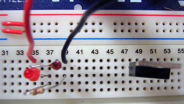El esquema muestra el regulador que vamos a construir. Yo he construido varios de estos y el diseño es bastante sólido. Comenzar colocando el LM317. Las clavijas ya que busca en la parte delantera (la caja negra) es AOI (ajuste hacia fuera en). Figura hacia fuera donde usted va a tener la no regulada 9V y tierra de la clavija de corriente viene en. Coloque un 0.1uF condensador tantalio entre las dos líneas, teniendo en cuenta la polaridad del condensador. Hacer lo mismo con un LED de 3mm de la línea positiva, seguida de un resitor de ohmios k 1 conectar el lado negativo del LED a la línea de tierra. Esto le dará un indicador de que hay energía que fluye en el regulador. Puede parecer redundante tener un LED aquí cuando nos vamos a poner otro en la línea decc V AVR, pero estamos haciendo esto con la idea de que el regulador de tensión será en última instancia en un tablero separado, y el piloto irá con él.