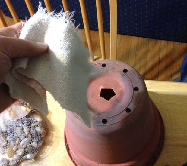 Corte una tira de tela de la toalla o trapo. Debe ser al menos tan largo como la altura de la maceta con drenaje y dos pulgadas de ancho. Ruede para arriba y el palillo a través del agujero cortado en la olla, a continuación, tire de él hasta que éste quede colgando fuera de la base de unas pocas pulgadas (es importante que el extremo inferior de la mecha está colgando hacia fuera por debajo de la olla por lo menos en cuanto a los ladrillos son altos--en otras palabras que la mecha tendrá que llegar a la parte inferior de los ladrillos, pero estando bien en el bote).