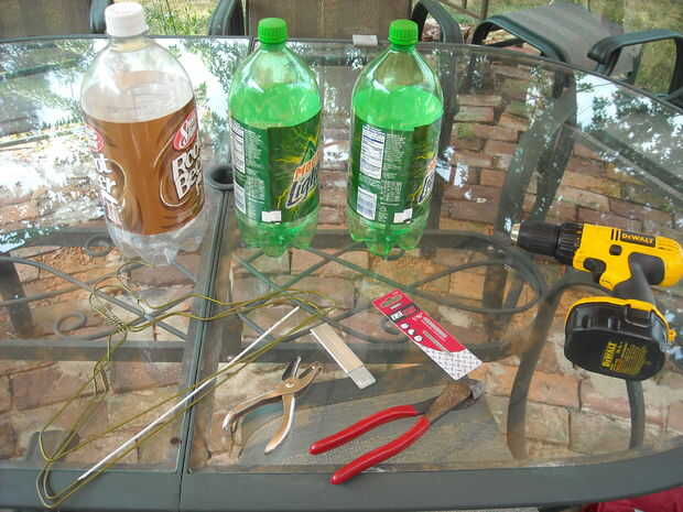 1. botellas de vacío de 2 o 3 litros (ellos antes de empezar o este proyecto obtiene algo pegajoso en el medio de enjuague) 2. perchas de alambre 3. caja de herramienta de corte o cuchilla 4. tijeras afiladas cortar plástico 5. tenazas 6. 1/16 del pedacito de taladro 7. taladro