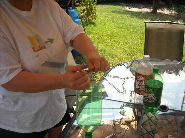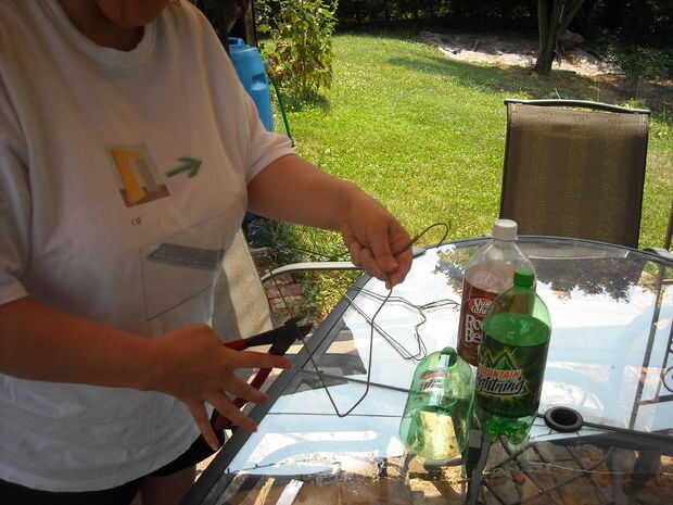 1. con el cortador de alambre, corte a través de la suspensión, media de la zona recta larga en la parte inferior de la suspensión. 2. staighten o los brazos de la suspensión de manera que apunten hacia abajo. 3. colocar un brazo en cada orificio de la botella y los extremos de la curva por lo que la botella es segura.