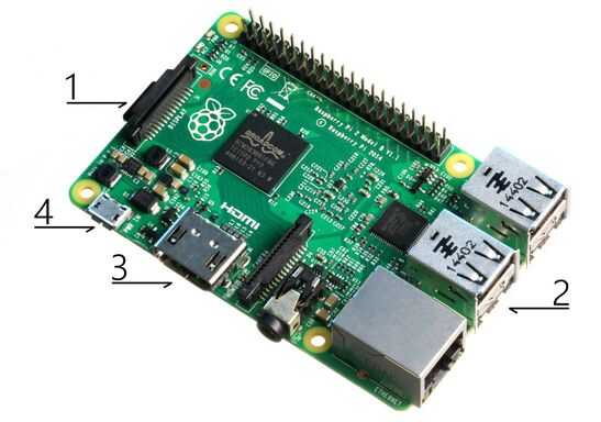 1. Inserte la tarjeta micro SD preparada en su frambuesa Pi 2 (la ranura se indica mediante la flecha #1 en la imagen de abajo).