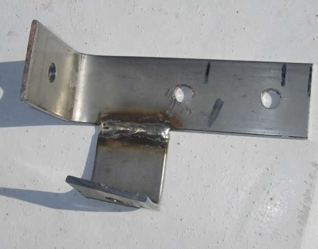 Después de mucho diseño y dibujo de Victor, Kenny ya cortado, perforado, doblado y soldado con autógena estos soportes. Muy fácil. Cuando haya enfriado el flujo fue "tik" y se cayó la soldadura. El área oscura alrededor de la soldadura es hollín del flujo. El soldador puede manipularon barras mucho más gruesas debido al acero inoxidable ' alta resistencia y baja conductividad térmica.
