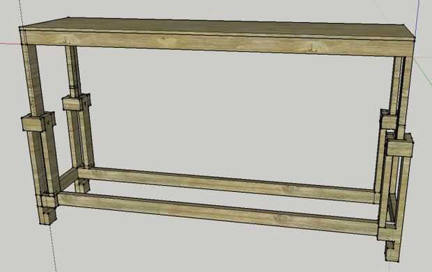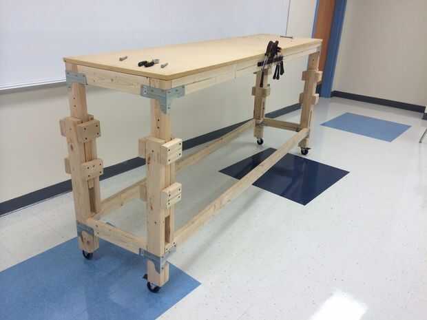 Resumen de diseño: El plan general de este trabajo es crear un marco reforzado de 2 × 4 con una sección inferior que guía el desplazamiento de la sección superior. Este diseño probablemente podría haber sido mejor, pero estoy trabajando con lo que tengo. Las direcciones que ofrecen construcción un banco de trabajo 2 ' ancho x 8′ largo de medición y pueden ajustar desde 36 a 56″ de altura. Fuertemente sugiero mantener la anchura y la longitud de la misma, porque entonces necesitarás solamente una sola hoja de madera contrachapada, y reducir al mínimo el número de cortes. Terminé encima de dos mesas de trabajo del edificio y planeo agregar un estante inferior para este diseño en el futuro.
