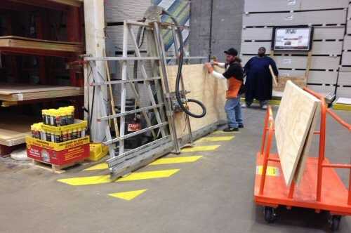 También decidí dejar Home Depot rasgar la hoja su sierra de panel en lugar de cortarlo yo mismo. En mi zona, de Lowe's y Home Depot corta una hoja de madera contrachapada dos veces por la hoja, de forma gratuita.