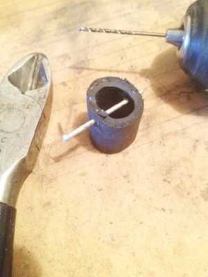Ver la segunda foto. Con la manguera en el agujero en la parte inferior del casco y el extremo con el acabado de uñas en primer lugar, corte dos botones de corcho del vino. Cosas uno en cada extremo del casco submarino en cuanto a cada uno se vaya. Una presa es necesario para mantener caliente pegamento fluya demasiado lejos dentro del casco. Aplique pegamento caliente en el casco por el extremo abierto de la manguera de goma. Tómese su tiempo para que pueda entrar en todos los rincones y grietas. Añadir suficiente pegamento caliente que el acabado del clavo es encerrado en él. No llene en exceso, para que no haya cabida más adelante para la levadura entre el pegamento y el casquillo de eje. Dar tiempo a enfriar completamente.