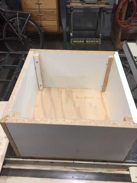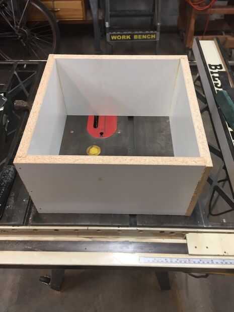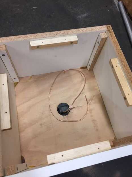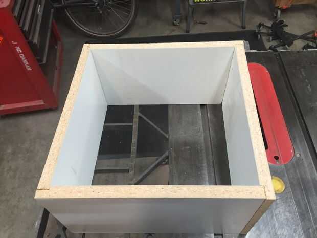 Finalmente, pegamento y clavo la partícula 13/16 "x 13/16" x 7¾" tablero piezas en todas las esquinas y a lo largo a lo largo de los bordes. Esto reforzará las esquinas y proporcionar un lugar de descanso para la madera contrachapada que va a ser el altavoz de la superficie de montaje. La madera de 13 "x 13" debe quedar al ras con la parte superior de la caja.