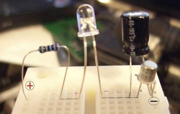 El 2N2222 entonces se conectan como sigue: colector a * tierra * y emisor a * positivo * pin en el condensador. Deje la base desconectado, doblado hacia arriba (sólo para la mirada). :)
