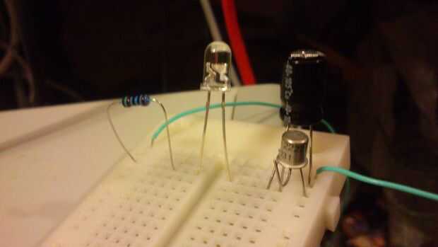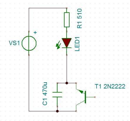De positivo en la alimentación, conecte la resistencia de otro extremo de la resistencia va al ánodo del LED, cátodo va al pin positivo en el capacitor y el pin negativo del condensador va al suelo.