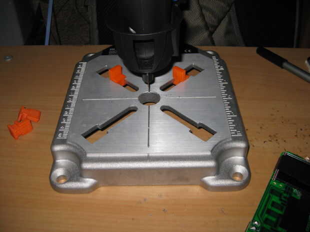 Taladro conjunto con su accesorio: lo uso para taladrar hols en placas PCB. También para el corte de la tapa posterior del control remoto para los pernos de la cabecera.
