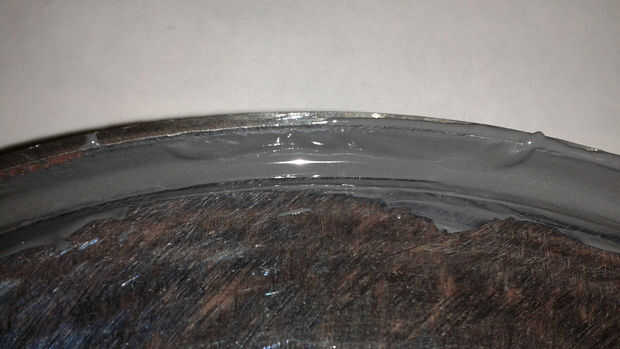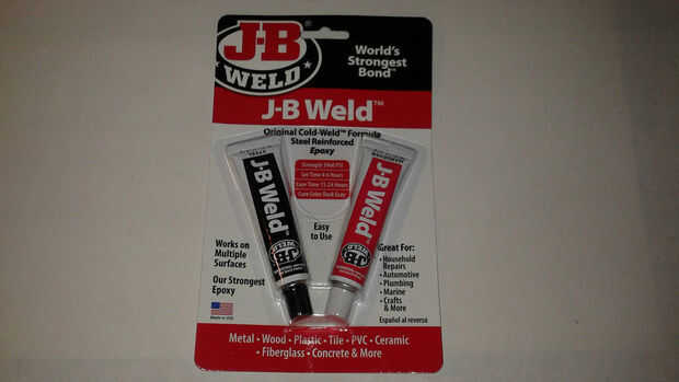 He añadido algunos trozos de cinta adhesiva para evitar que las dos piezas del tambor se mueva como que había pegado. Que mezclan algunos J B soldadura y una espátula pequeña de una vieja tarjeta de regalo para difundir en el espacio donde se unieron las piezas. Trabajé el adhesivo en la ranura alrededor del tambor y dejó toda la noche para curar.