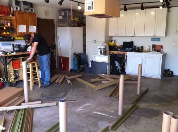 Para este trabajo, todo lo que realmente necesitas es cartón, cinta adhesiva para conductos (regular gris, gris oscuro, blanco y negro) y algo para cortar con (utilidad cuchillo funciona muy bien). También utilizamos algunas herramientas en el camino, sólo para acelerar el trabajo, no son necesarios. Además, obtener tanta cartulina como usted puede conseguir sus manos. Fue a o llama cada tienda de electrodoméstico en la ciudad pidiendo cartón. Solicitar cajas de nevera, lavadora y secadora cajas, que nada grande funciona muy bien. También, asegúrese de solicitar la cartulina muy dura usada para proteger las esquinas de los aparatos. Estas son una necesidad en un primer paso de pareja. Y, en cuanto a la cinta, creo que terminamos usando unos 60 rollos.