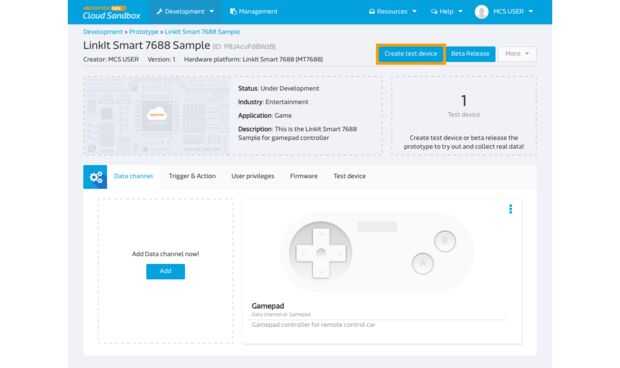 Después de agregar el canal de datos, ahora crear un dispositivo de prueba. Esta prueba es igual que la placa de desarrollo. Cuando se conecta la placa de desarrollo a MCS, usted puede recibido datos procedentes de la Junta de desarrollo y también dar comando al dispositivo así.