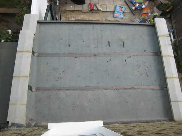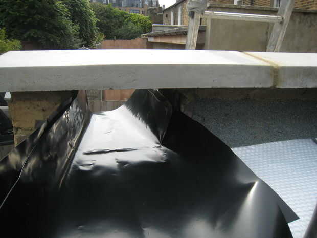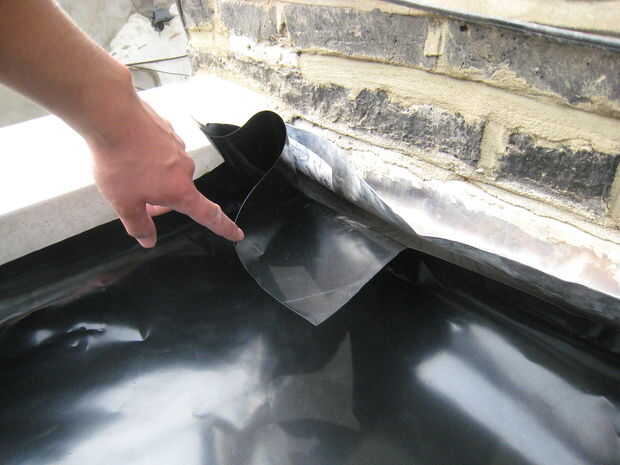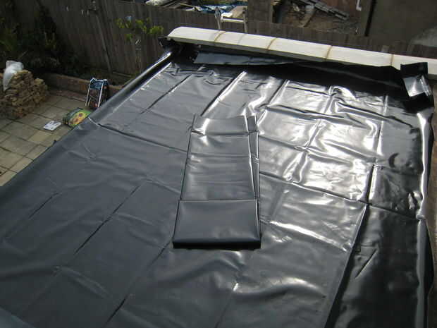 2. Extienda el estanque liner número 1 teniendo cuidado de meter bajo cualquier líder que tienes en el borde de la azotea - agua de la lluvia sale de las paredes, golpea la cabeza y luego va dentro, en lugar de bajo el forro del estanque