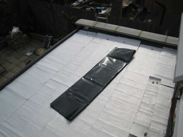 1. Extienda el aislamiento en el techo y corte a la medida - nb: / lo hice en un día muy soleado (sí lo hacemos ocasionalmente en Londres!) y estaba de pie en un tejado de plata!