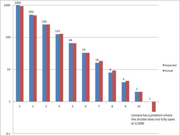 Sé de investigación adicional que existe un problema con esta cámara. en 1/500th de segundo el obturador abre sólo el 80% de la manera antes del cierre, esto significa que las medidas de tiempo son correctas, pero en realidad sólo produciría el 80% de una fotografía usando esta velocidad. En 1/1000, el obturador abre solamente el 20% de la forma, por lo que se cortó la luz al sensor de apagado muy rápidamente, resultando en una lectura de 400 en lugar de la esperada 1ms. Este problema es probablemente debido a la seca lubricante en el mecanismo de obturación lo que abra correctamente a altas velocidades.