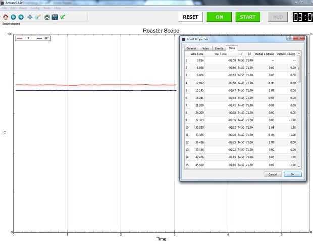 Me metía las lecturas de la temperatura entre 70 y 74 grados Fahrenheit, con mi termopar ET a una temperatura ligeramente más alta que mi termopar BT - que puede verse en la imagen de abajo.