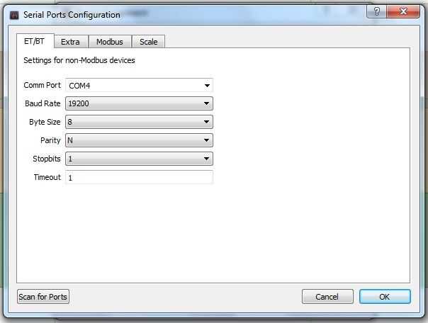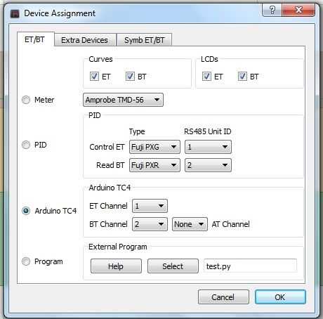 1) haga clic en Configuración >> dispositivo. Seleccione Arduino TC4 y prendió al fósforo encima de los canales de termopar ET y BT con los terminales que están conectadas a tu Arduino. Cuando haga clic en aceptar, le llevará a la configuración de puertos serie. Asegúrese de que su tasa de baudios es la misma en su sketch de Arduino es aquí - casi siempre es 19200. También asegúrese de que su puerto Comm se empareja para arriba con el mismo puerto Comm que tu Arduino está conectado al ordenador.