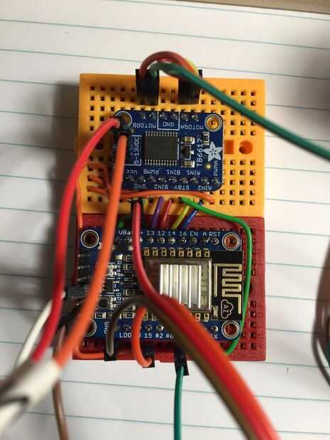 Aunque el ESP8266 Huzzah puede apoyar una fuente de 12v, su regulador se calientan algo como camina el voltaje para el módulo de ESP8266, así que decidí usar una fuente de 5v independiente a la ESP8266 HUZZAH y lleva una fuente de alimentación de 12v directamente sobre el poder de TB6612 Vmotor. Asegúrese de dejar las GNDs y 3v lleva todo en su lugar.