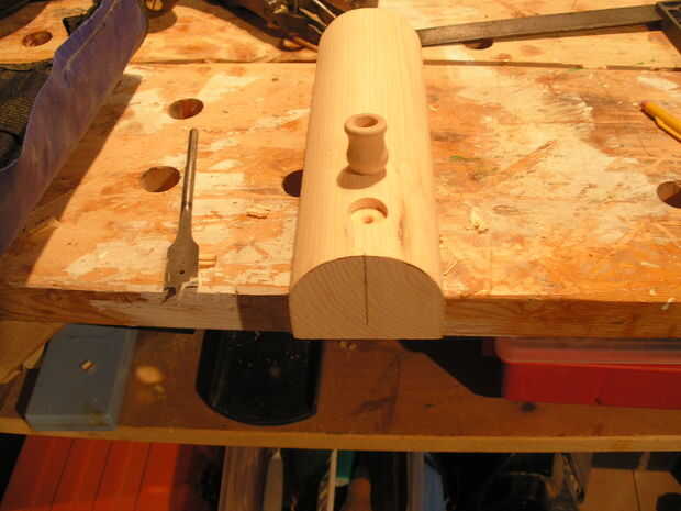 1. con la punta de pala (ancho suficiente para asegurar el sostenedor de vela de tamaño que usted eligió, yo usé 3/4 de pulgada) taladro superficial para cuna chimenea (que es un sostenedor de vela). Este los agujeros hace parecer como si un ingeniero de alta precisión había unido las partes separadas del motor de vapor de una manera planificada.
