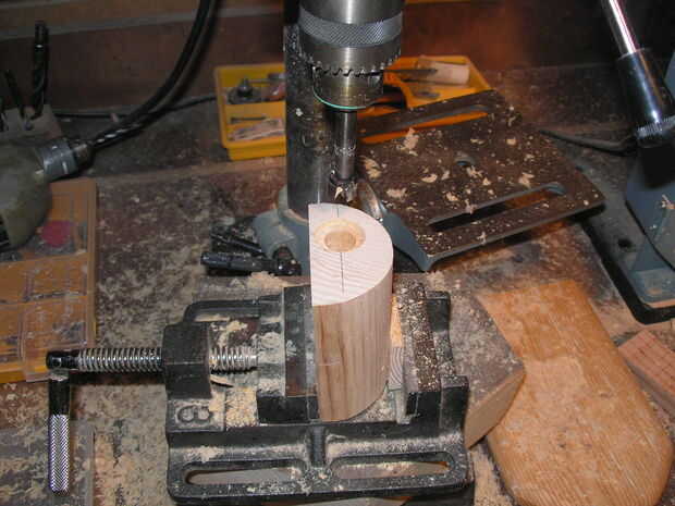 2. Sujete el motor (asegurándose de proteger con los cojines) y perfore el centro de la chatarra después de marcar el espesor de la cubierta con la brújula. Taladre el agujero con dos pedacitos de forstner, primero una pequeña ~ media pulgada y el segundo grande! 1 pulgada. El orificio más pequeño ayuda a eliminar los residuos de la perforación más grande puesto que la basura tiene un lugar para ir, además de facilitar el proceso de perforación con dos pasadas.