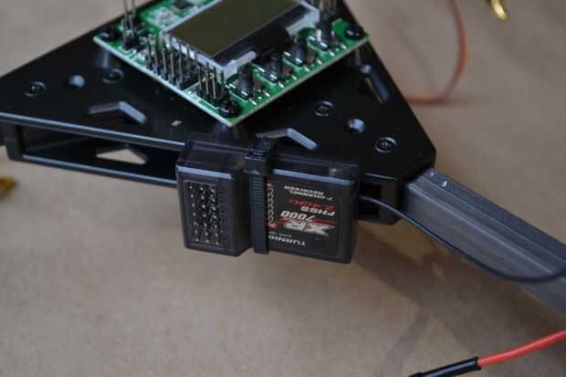 Es fácil colocar el receptor de radio. En primer lugar, lazo una amarra por dos de los agujeros triangulares en el lado del Rotor Bits tricopter hub. Ponga el receptor de radio a través del lazo para que los conectores del receptor cara hacia el exterior y son accesible (véase el cuadro). Luego, apretar la amarra tanto como sea posible.