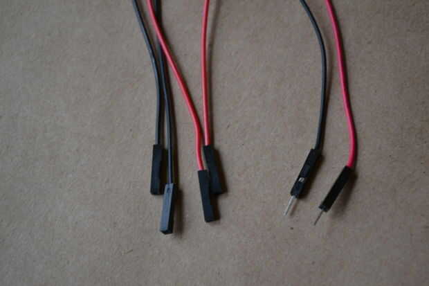 Vamos a hacer alguna cirugía en cuatro de nuestros cables de puente. Por lo tanto, sacar dos cables de puente rojo y dos cables de puente negro. Cortar todos los cables por la mitad y agarrar dos conexiones hembra rojizas, dos conexiones hembra negras, una conexión macho rojo y una conexión macho negro.