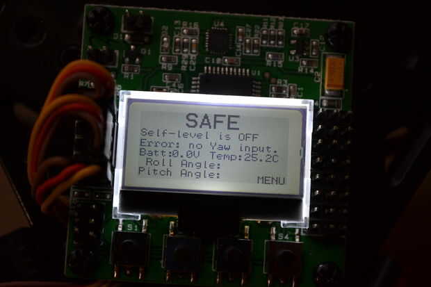 Puesto que apenas atamos nuestra potencia UBEC a la KK2.1 a través del receptor de radio, su KK2.1 debe activarse ya. En la pantalla, verá una gran etiqueta "Segura", seguida de información sobre varios sensores. En la esquina inferior derecha de la pantalla verá un elemento de menú.